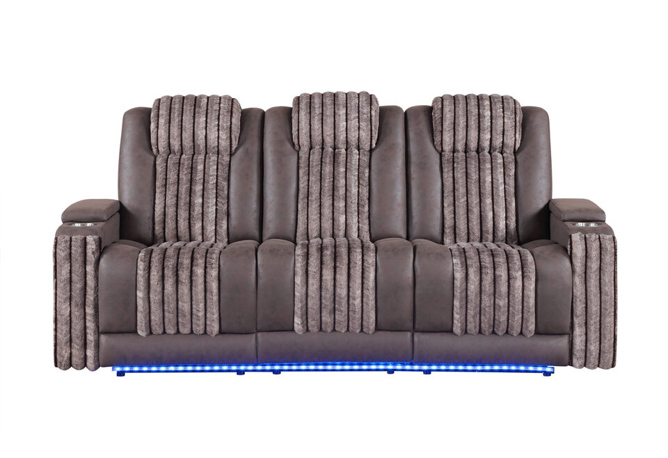 U8000 BROWN POWER RECLINING SOFA W/POWER HEADREST, DROPDOWN TABLE W/ WOOD TRIM & READING LIGHT, & LED LIGHT